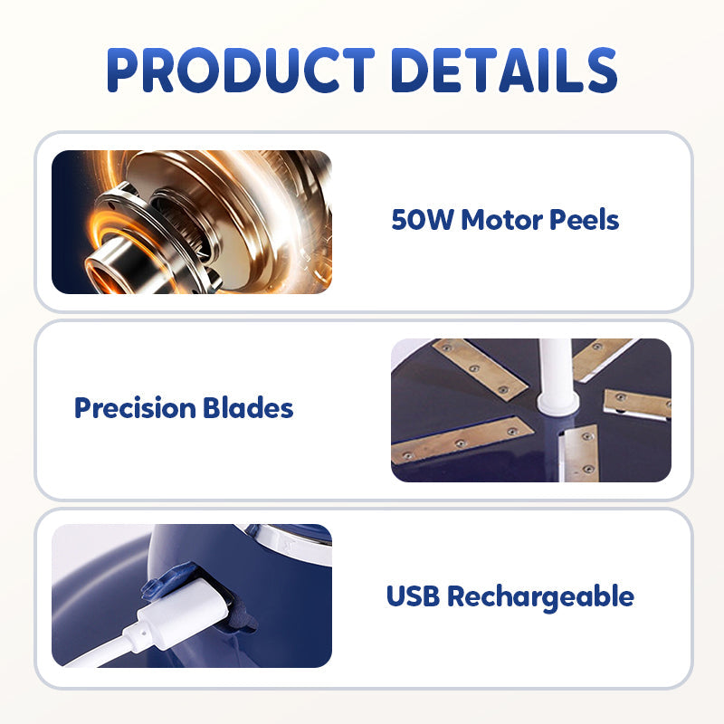 VÁLASSZON, MINTHA VARÁZSLATOSAN, ERŐFESZÍTÉS NÉLKÜL, ZAVAR NÉLKÜL – Csak nyomja meg a gombot, és hagyja, hogy a gép elvégezze a munkát – 25 másodperc alatt tökéletesen meghámozott gyümölcsök. Az 50 wattos motor erőteljesen hámoz, de az intelligens hűtési technológia révén, amely megakadályozza a túlmelegedést, csendes marad.