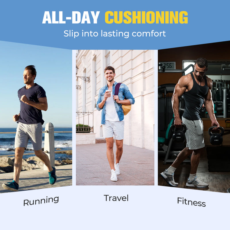 PÁRNAZOTT KÉNYELEM – Puha minden lépésnél. A talp mentén elhelyezett puha frottír párnázás minden lépésnél puha érzést és ütéscsillapítást biztosít. Akár sétál, fut vagy áll, élvezze a tartós kényelmet, amelynek célja a láb fáradtságának csökkentése és az általános viselhetőség javítása.